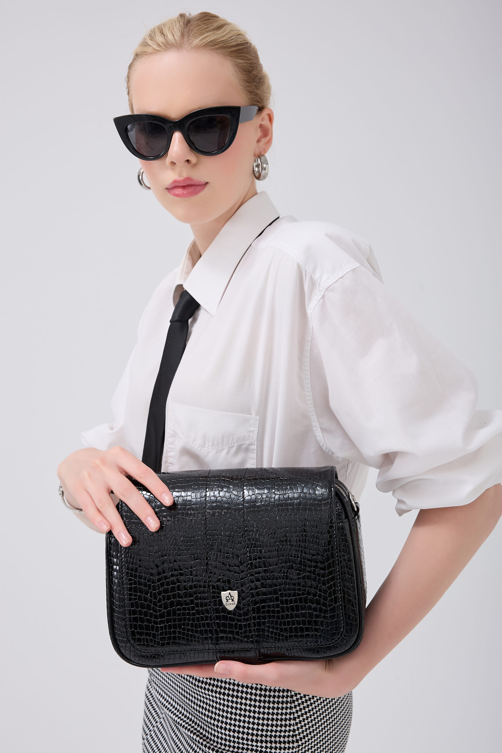 A Class Hakiki Deri Parlak Siyah Bayan El ve Omuz Çantası 26x19x10 Cm