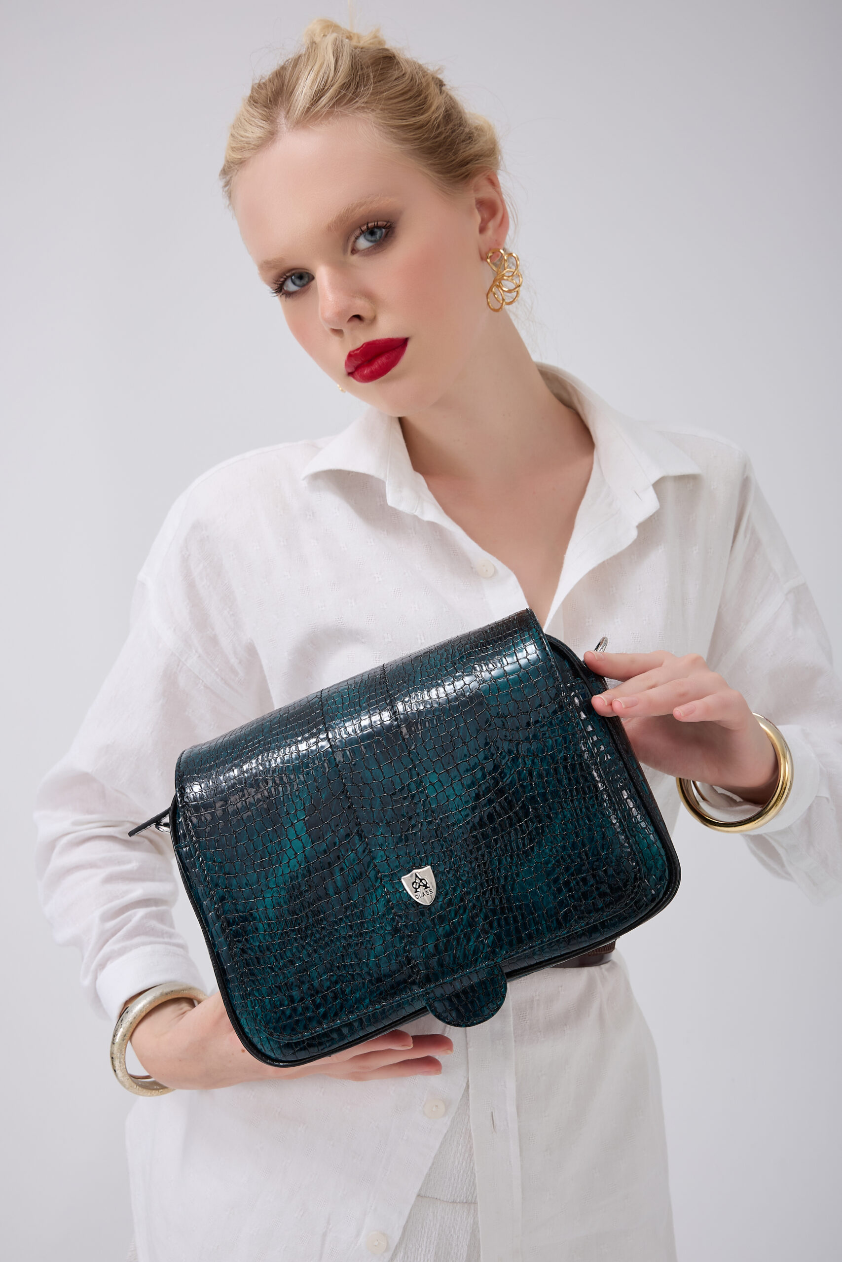 A Class Hakiki Deri Parlak Zümrüt Yeşili Kadın El ve Omuz Çantası 26x19x10 cm