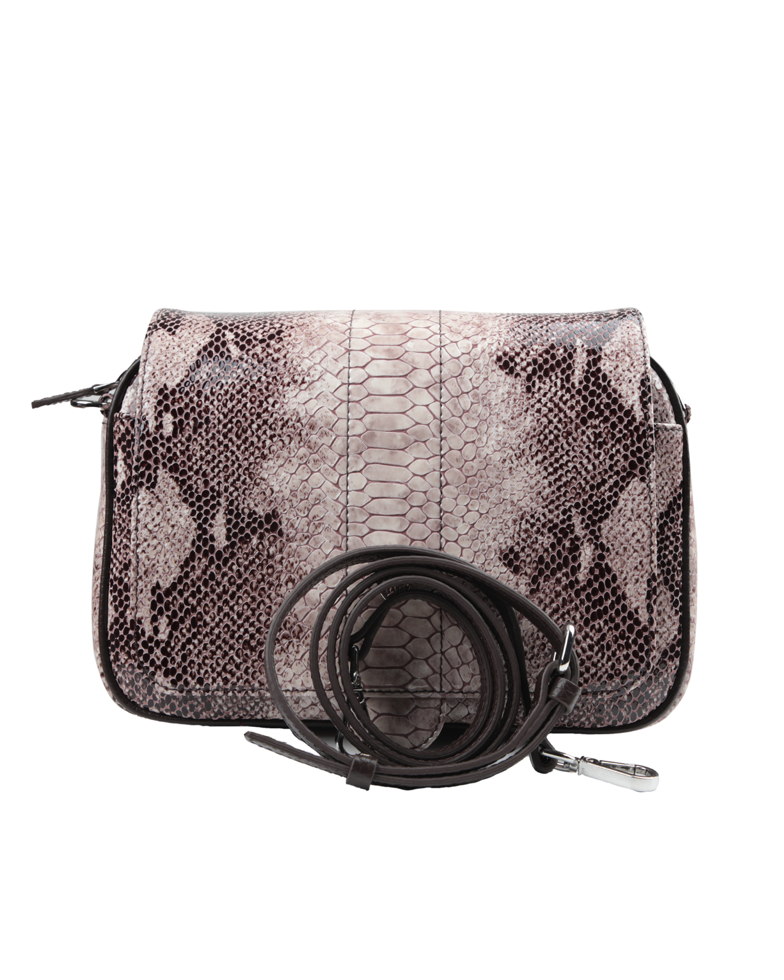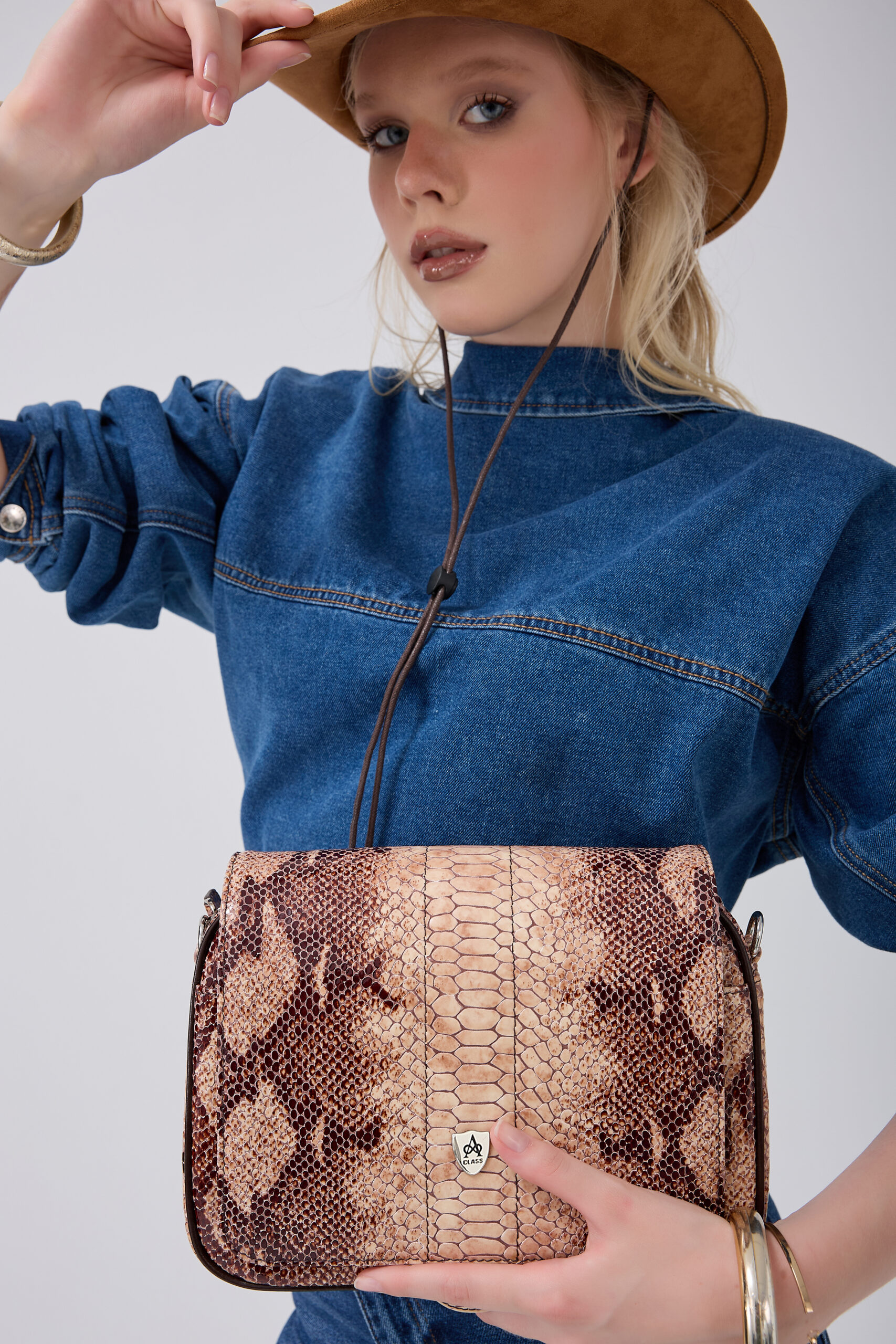 A Class Hakiki Deri Parlak Bej Yılan Desenli Bayan El ve Omuz Çantası 26x19x10 cm